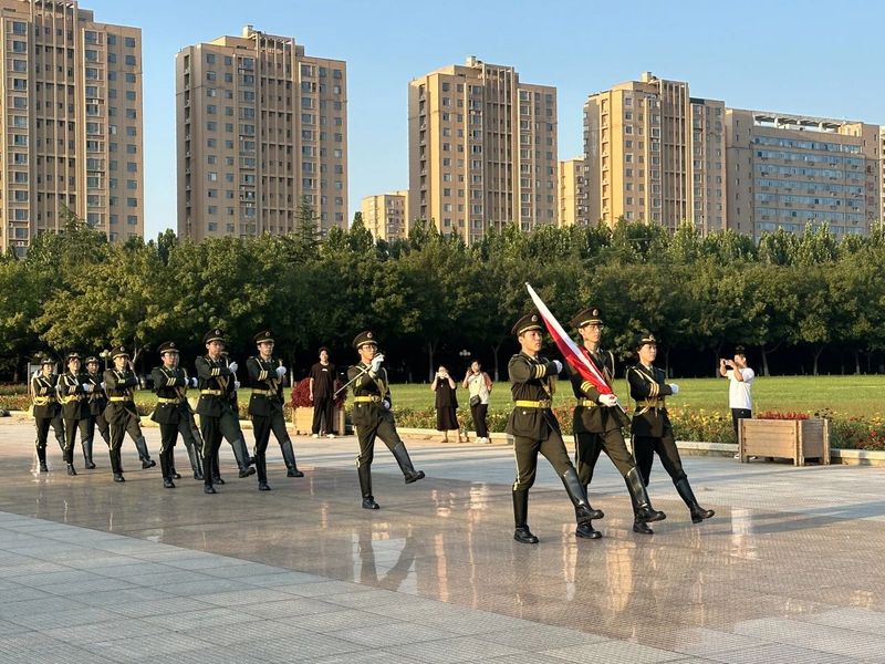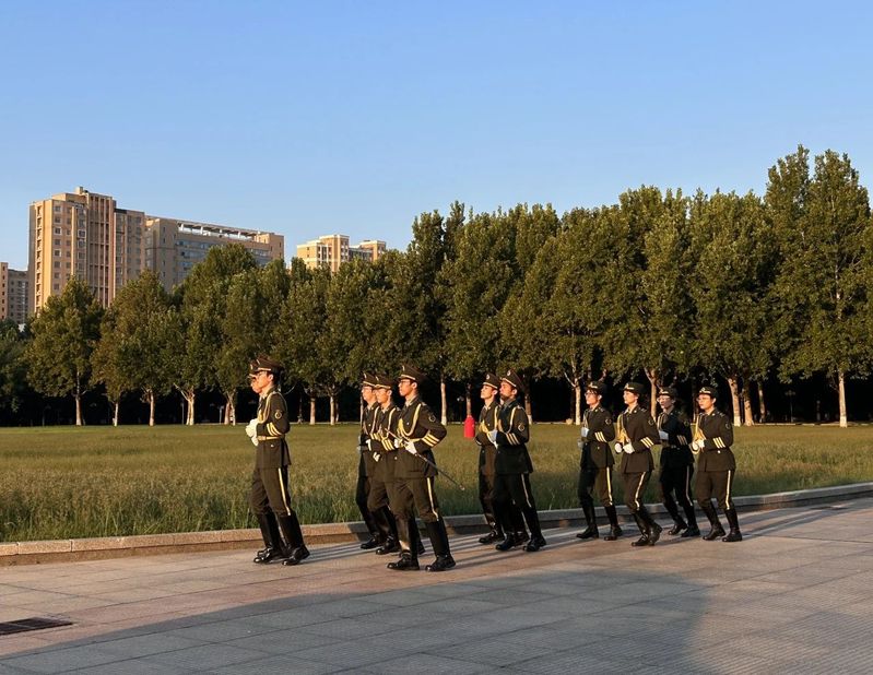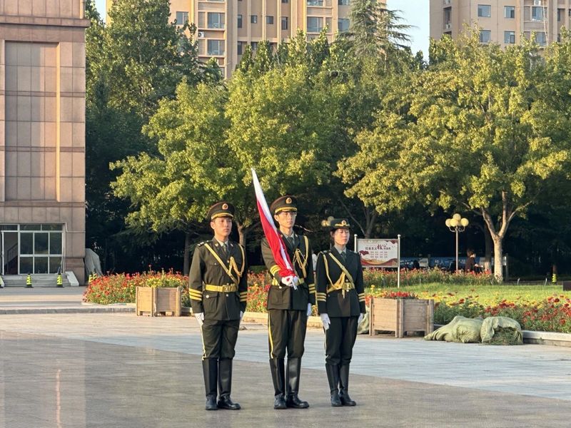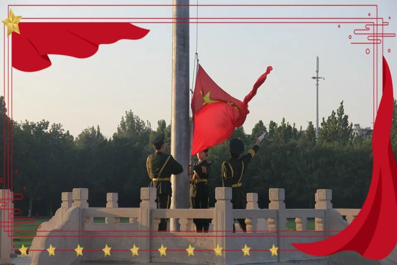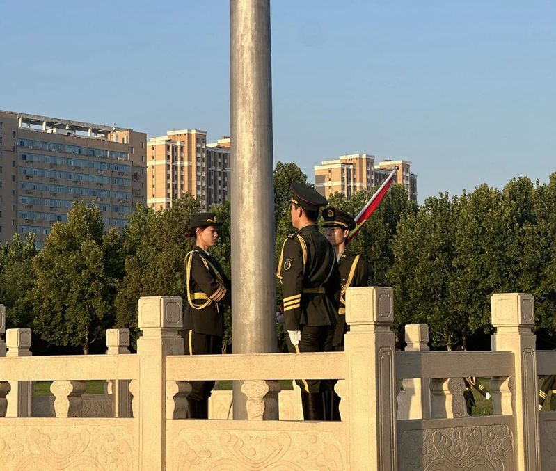 仪式首先进行的是出旗环节。护旗手们在晨曦中,伴随着庄重嘹亮的歌声,迈着矫健且坚定的步伐走向升旗台,展现了我国青年的风采。