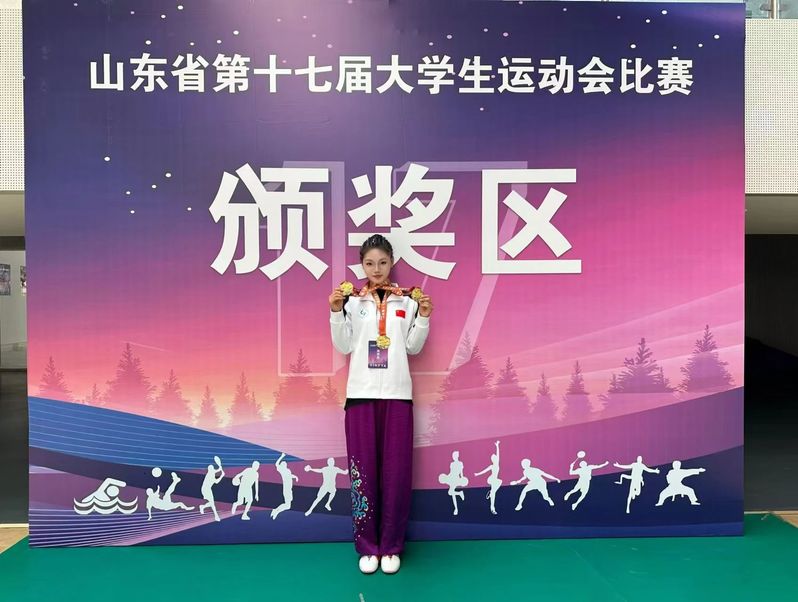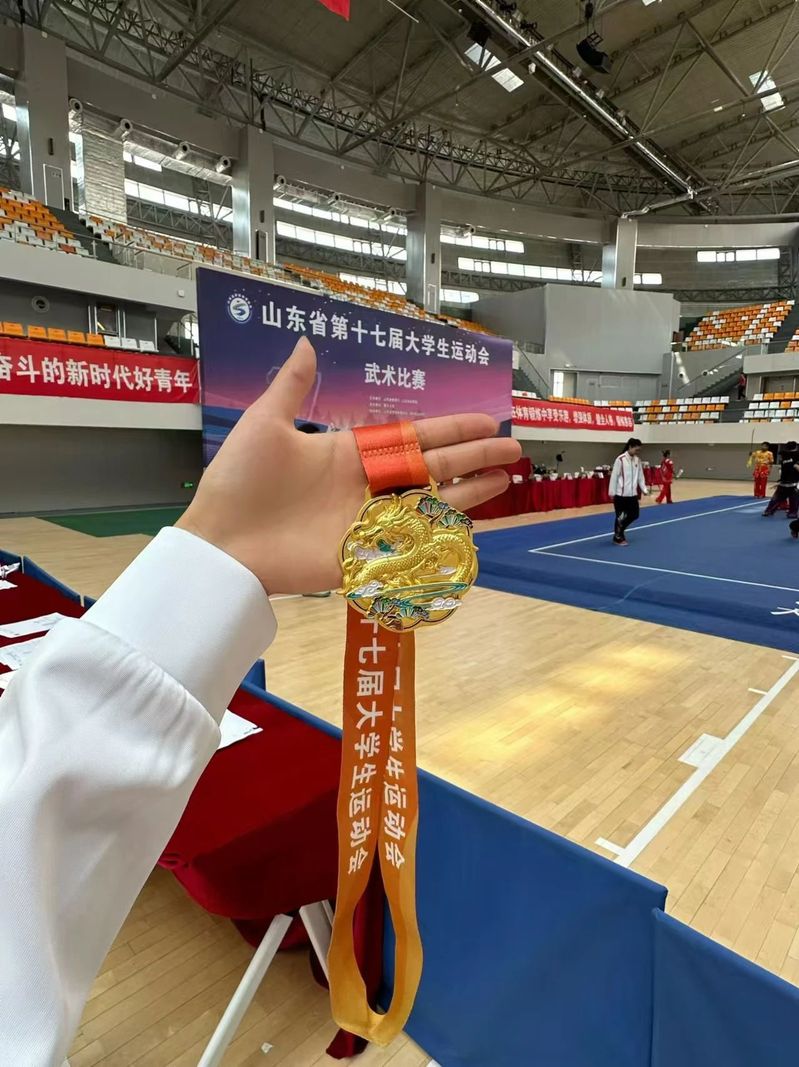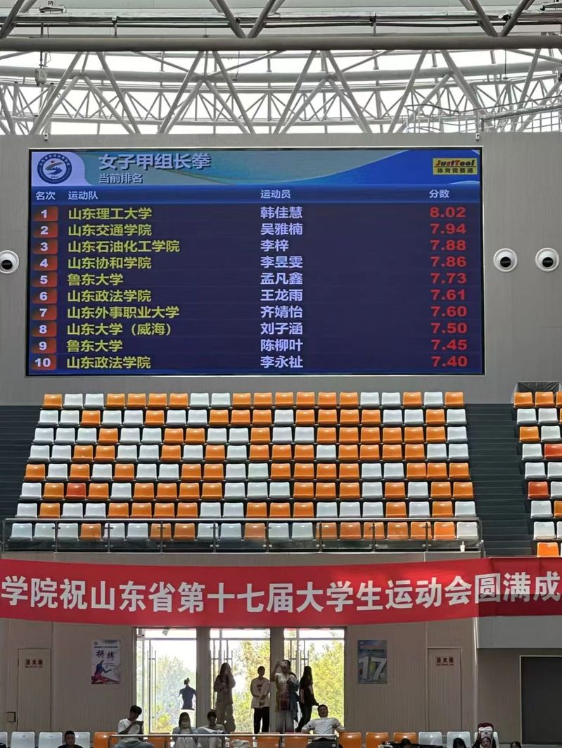 9月22日至25日,山东省第十七届大学生运动会武术比赛在潍坊职业学院正式开赛。我院服装表演专业2022级学生韩佳慧在女子甲组长拳比赛中以8.02分的成绩勇夺冠军。