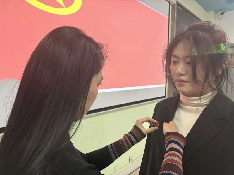 紧接着,辅导员刘舒为新团员佩戴团徽,团徽不仅是共青团员荣耀的象征,更意味着新团员们肩负起的沉甸甸责任。在未来的学习生活中,新团员要坚定理想信念,不断“追逐光”,凭借不懈努力练就本领“成为光”,最终以实际行动在集体中“散发光”,发挥模范带头作用。