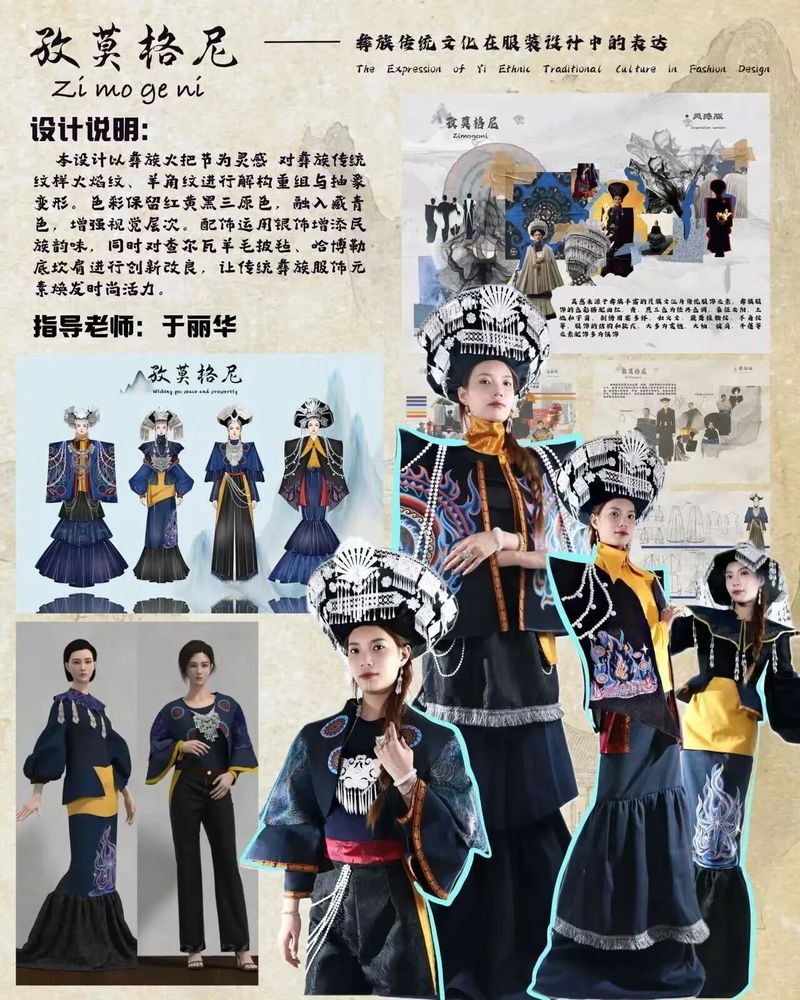 我院学子赵苡彬在赛前准备阶段,便在专业教师的指导下确立创作方向。她深入研读彝族传统服饰文化,从古老纹样、特色色彩中提取核心文化符号,同时结合现代设计的简约美学与实用需求,将传统元素与当代创意巧妙融合。最终,其参赛作品以鲜明的文化辨识度、流畅的视觉表达,精准诠释“丝路文化互鉴共生”的赛事主题,成功从众多优秀作品中突围,荣获赛事优秀奖。这一成绩不仅是对赵苡彬个人专业能力的肯定,更展现了我院学子在跨文化设计语境下的创新思维与文化传播意识。