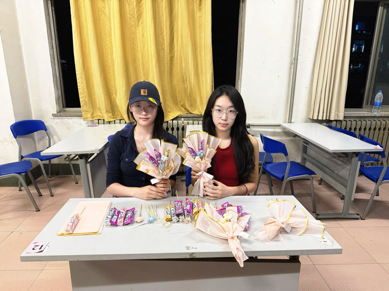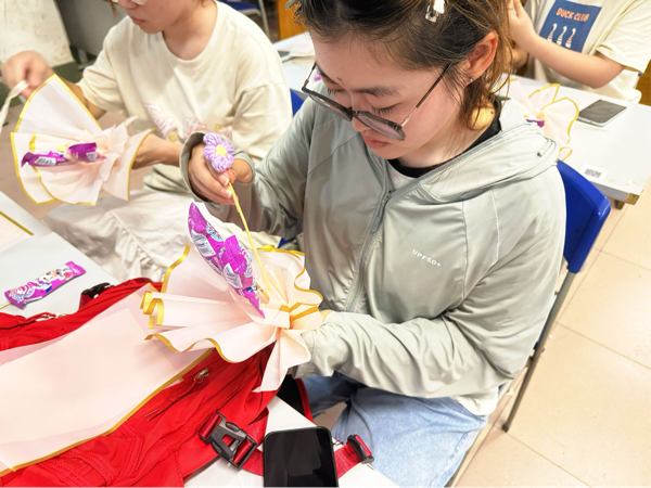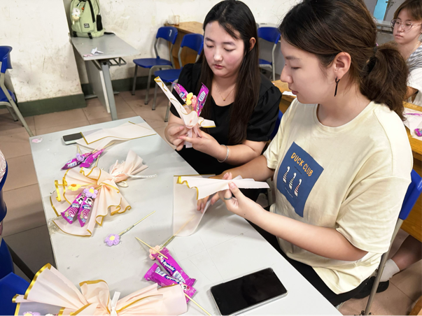 活动前,工作人员布置现场,分类摆放彩色棒棒糖、花杆、包装纸以及丝带等材料。活动中,志愿者示范操作,讲解棒棒糖固定、花杆组装、包装塑形及丝带点缀的步骤与注意事项。随后学生分组制作,按设计搭配材料完成组装,部分学生插入手写祝福卡片,大家交流技巧,现场秩序井然