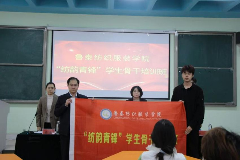 最后,校团委负责人为培训班授旗,宣布“纺韵青锋”学生骨干培训班开班。