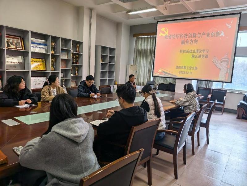 为深入推进党建与业务深度融合,精准对接山东省纺织服装产业科技创新发展需求。12.11日,纺织系教工党支部在学院会议室开展“我省纺织科技创新与产业创新融合方向”专题学习会。学院长姜兆辉以“我省纺织科技创新与产业创新融合方向”为题讲授专题党课,纺织系全体教工党员参加学习。