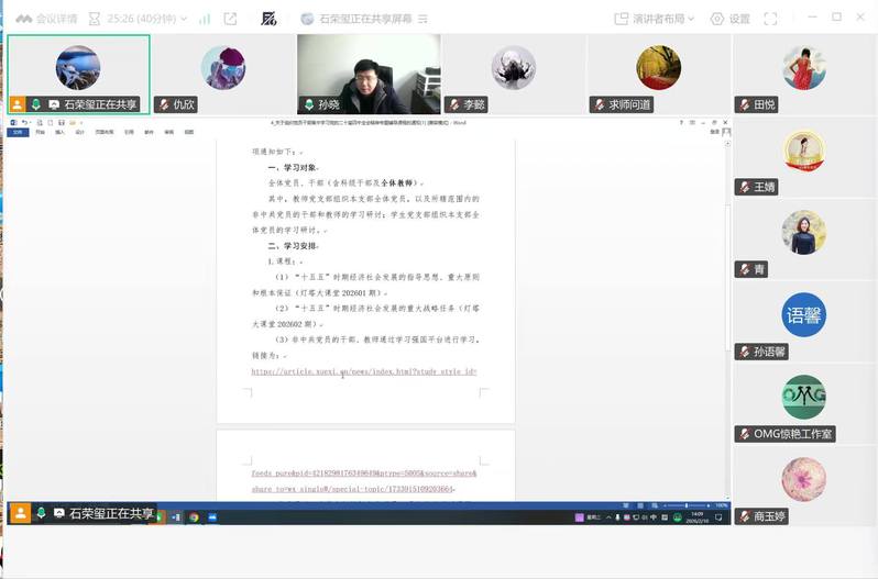 为深入学习贯彻党的二十届四中全会精神,切实把党员及教师的思想和行动统一到党中央决策部署上来,2月10日下午,服装系教工党支部全体党员及服装系全体教师集中学习《“十五五”时期经济社会发展的指导思想、重大原则和根本保证》,党支部书记石荣玺主持,学习采用线上腾讯会议集中学习和研讨交流方式进行。