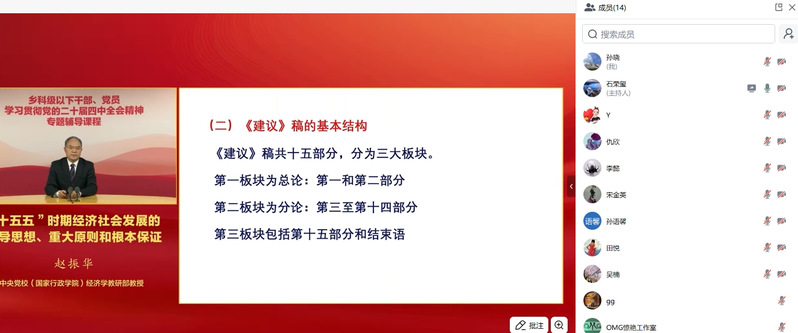 随后,全体一起进行课程学习,课程为中央党校经济学教授赵振华主讲。赵教授紧扣“十五五”时期发展主题,系统解读了这一时期经济社会发展的指导思想、重大原则和根本保证。他深入阐释了坚持党的全面领导是中国特色社会主义事业发展的根本保证,“十五五”时期要进一步加强党对新经济组织、新社会组织、新就业群体的领导,深化党建与业务融合,以高质量党建引领新业态、新领域健康发展,不断夯实党执政的阶级基础和群众基础。