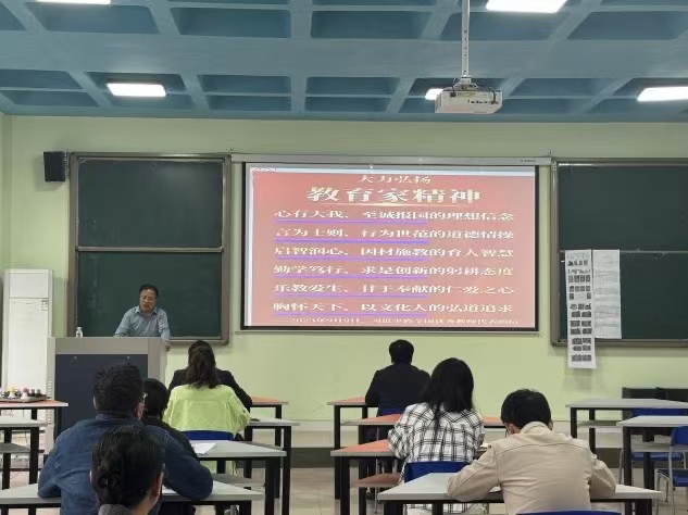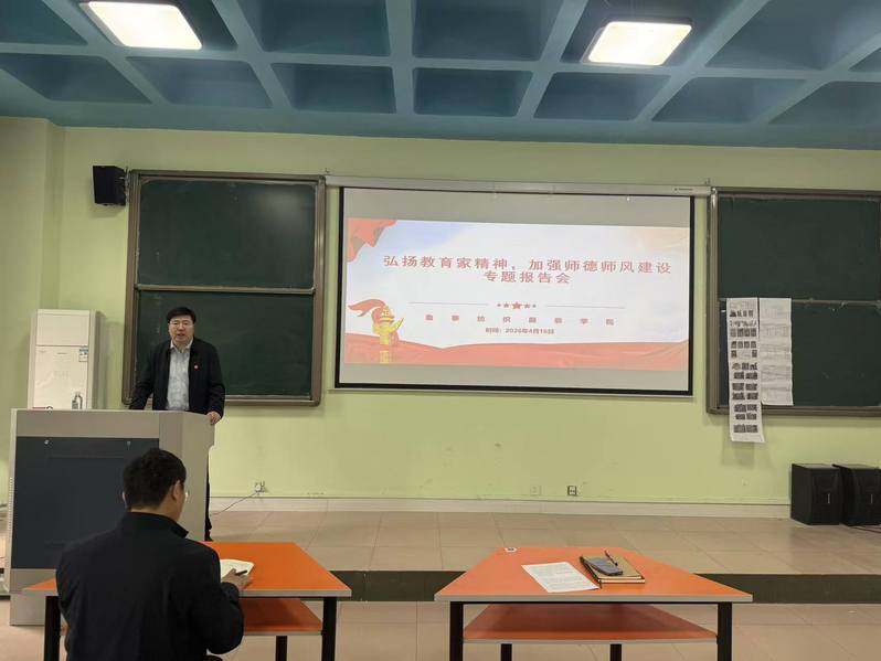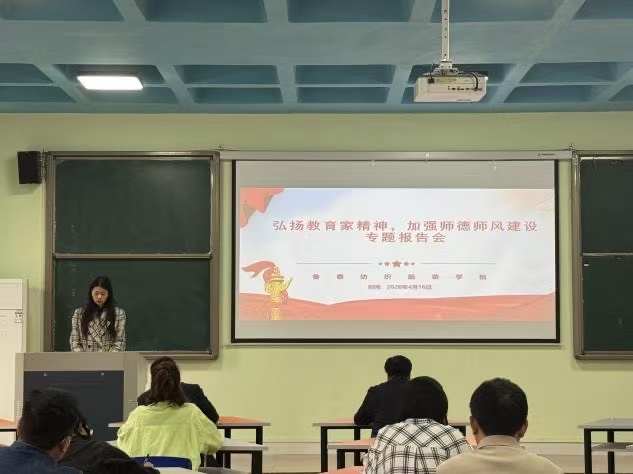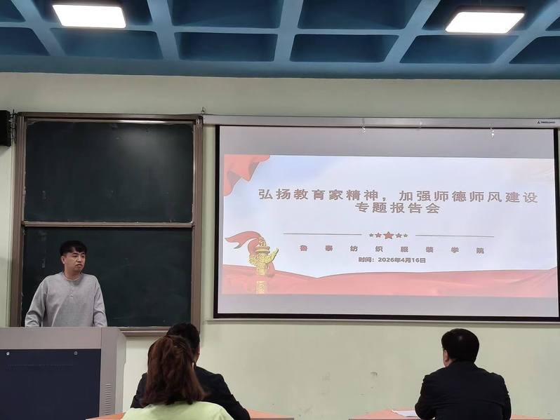 4月16日下午,鲁泰纺织服装学院在1号教学楼205室召开“弘扬教育家精神,加强师德师风建设”专题报告会。学院党委书记孙晓主持会议,全体教职工参加。