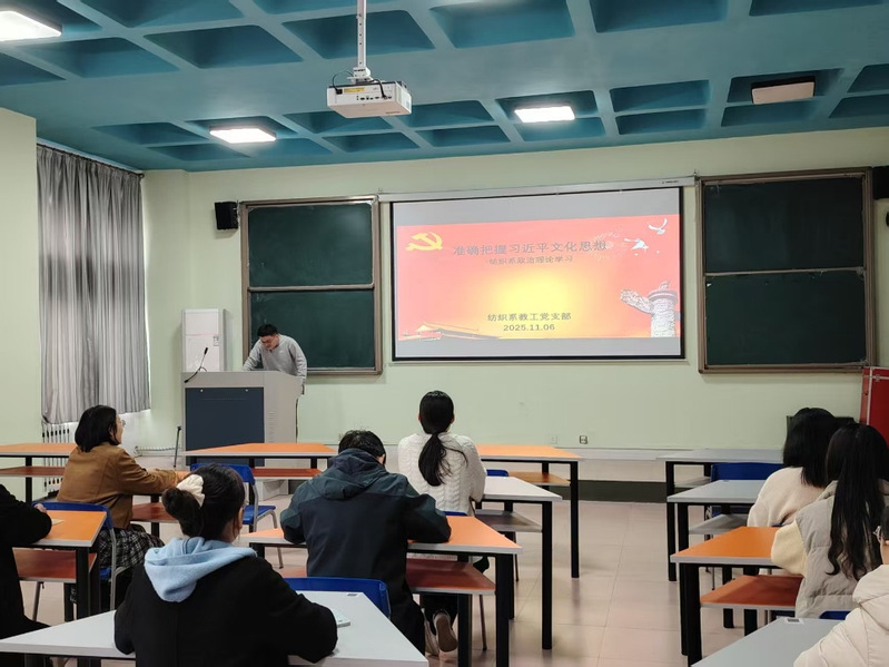 为深入学习贯彻习近平文化思想,推动其与纺织专业教育教学、科研创新深度融合,纺织系教工党支部于 2025 年 11 月 6 日在205教室召开“深学笃行习近平文化思想,赋能纺织文化传承创新” 主题党日活动。活动由党支部书记李建明同志主持,全体支部党员教师全程参与。